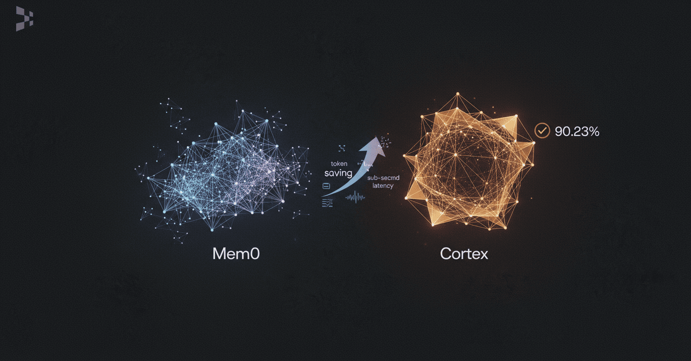 Mem0 focuses on cost efficiency and token usage, making it optimal for single-tenant scenarios. Cortex offers a self-improving memory layer with strong temporal reasoning, ideal for enterprise multi-agent deployments.